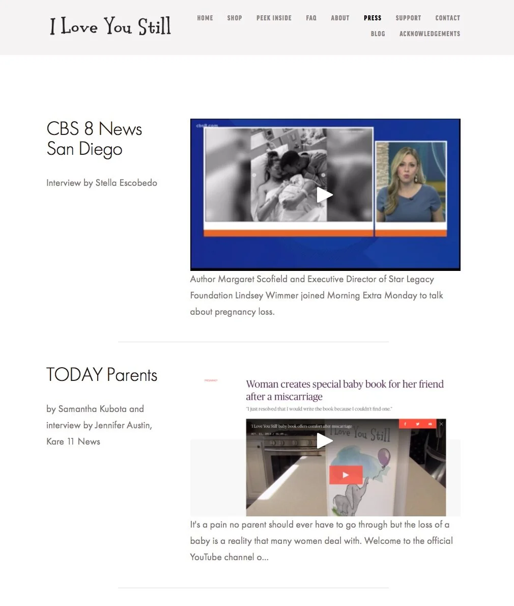 A true passion project, this site was created in support of my book, I Love You Still: A Memorial Baby Book (2018). The book went on to become a national best seller; it’s available at all major retailers nationwide and select retailers overseas. The site’s ample white space and bright colors echo the aesthetic of the book. The template was designed for easy navigation and quick content drill-down.